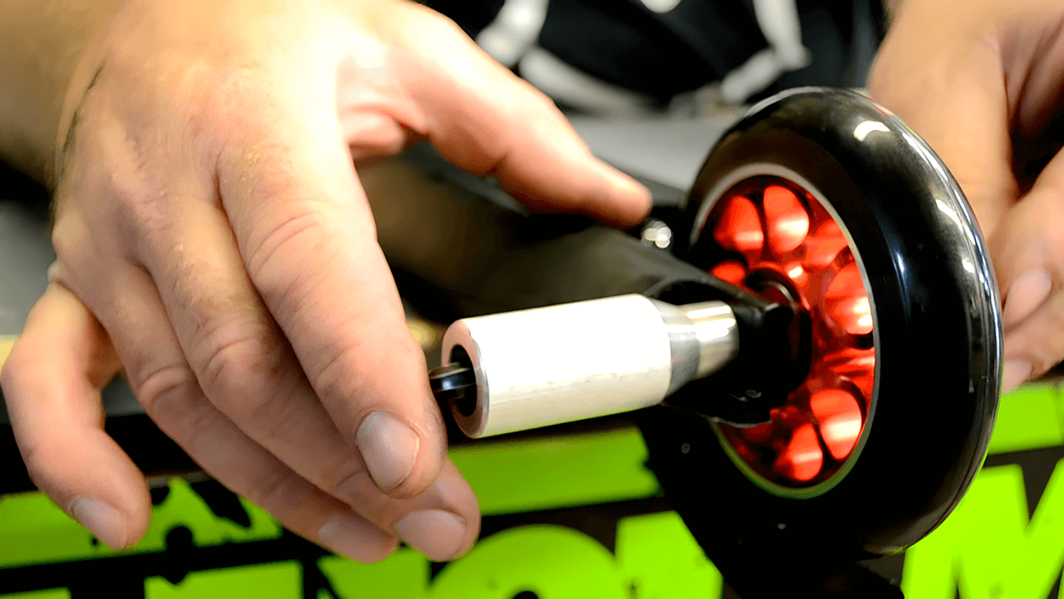 - Переверните самокат и снимите колёса, используя гаечный ключ.